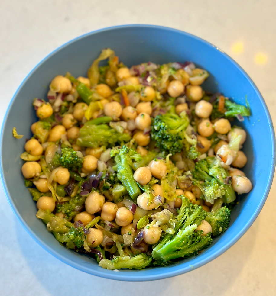 Chickpea Salad with Broccoli, Spinach, Kale, and Brussels Sprouts